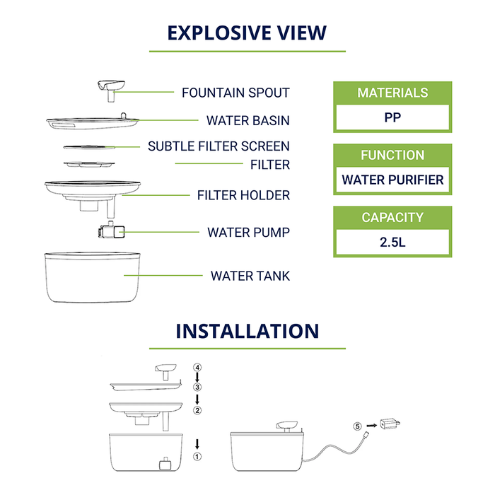 The Cat Water Filter Fountain provides a continuous flow of fresh, filtered water to encourage your cat’s hydration. Equipped with a multi-stage filtration system, it removes impurities and odors, ensuring clean and appealing water. Its quiet pump and easy-to-clean design make it a practical and hygienic choice for maintaining your pet’s health. Ideal for cats who prefer running water, this fountain supports better hydration habits and overall well-being.